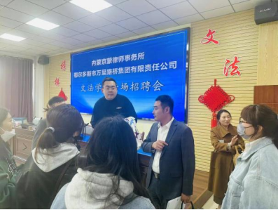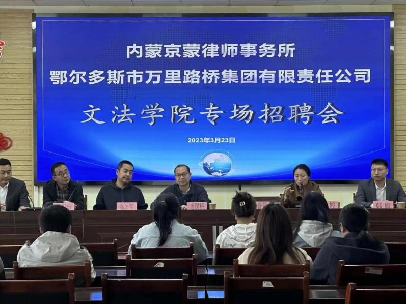 2023年3月23日下午,内蒙京蒙律师事务所和鄂尔多斯市万里路桥集团有限责任公司应邀在明德楼东A411举办法学、汉语言文学、和秘书专业的专场招聘会。内蒙京蒙律师事务所主任段普复、执业律师韩博,鄂尔多斯市万里路桥集团有限责任公司常务副总乔婷、经营副总高旭军一行到访永利3044集团官网。文法公司党委副书记兼副经理唐国桥、法学系副教授郝振明、毕业班班主任以及全体在校毕业生参加了此次招聘会。