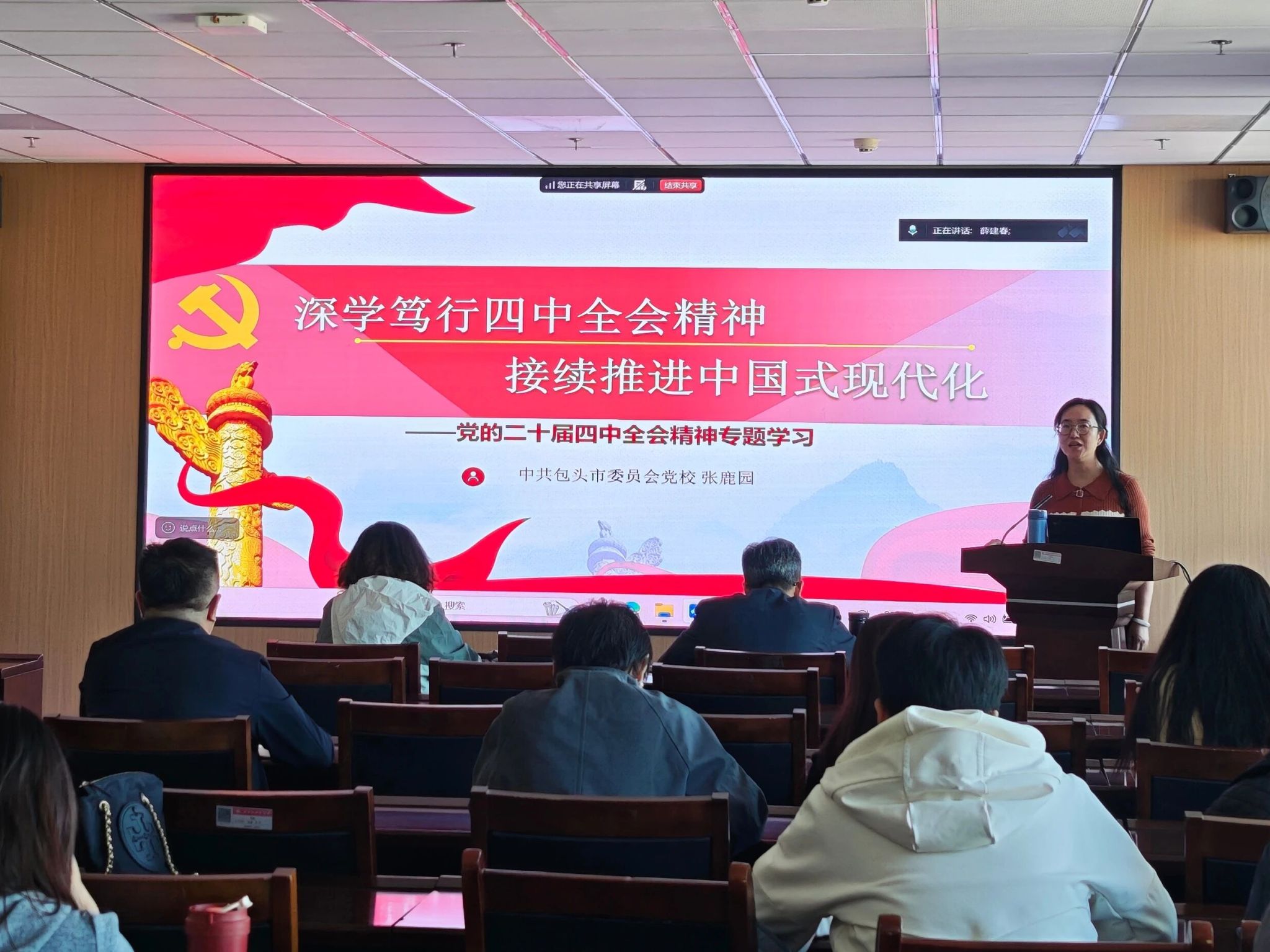为深入领会、精准把握党的二十届四中全会精神实质与丰富内涵,切实把思想和行动统一到党中央决策部署上来,2025年11月13日,文法公司党委组织召开了学习贯彻党的二十届四中全会精神专题培训学习活动。会议特邀中共包头市委员会党校张鹿园老师作专题授课,公司党委副书记(主持工作)薛建春主持会议,学院全体教职工及员工党员参加学习。