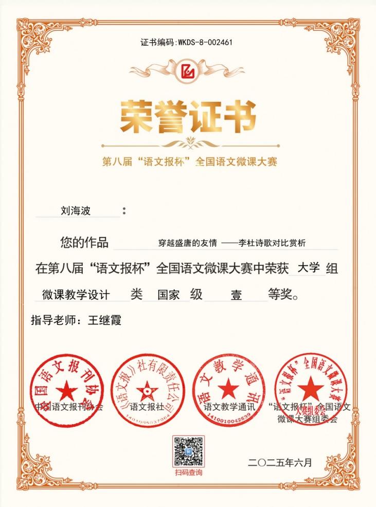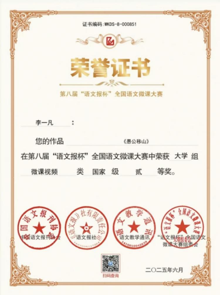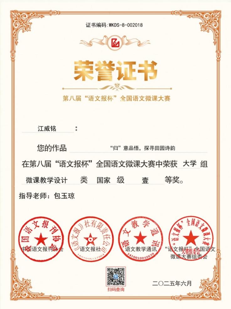 2025年5月30日,第八届“语文报杯”全国语文微课大赛评审结果正式揭晓,经过组委会专家严格评审,公司学科教学(语文)硕士教育中心学子凭借扎实的专业素养和出色的教学实践能力脱颖而出,斩获多项国家级奖项:江威铭、刘海波荣获微课教学设计类国家级一等奖,刘宇彤获微课教学设计类国家级二等奖,李一凡获微课视频类国家级二等奖。