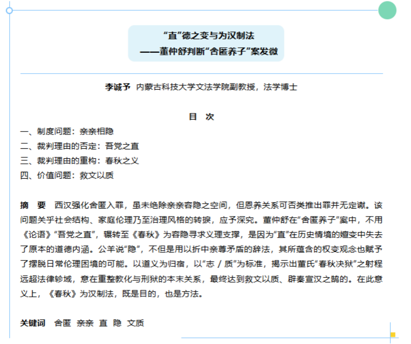 公司法学系教师李诚予副教授在《华东政法大学学报》2025年第6期上发表高质量学术论文《“直”德之变与为汉制法——董仲舒判断“舍匿养子”案发微》。《华东政法大学学报》先后入选CSSCI法学来源期刊、中文法律核心期刊和中国人文社会科学法学核心期刊,并获评“全国高校百强社科期刊”“全国高校社科精品期刊”“上海市最佳学报”。