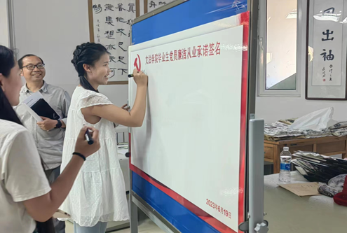 之后全体毕业生党员进行廉洁从业承诺签名、集体合唱《没有共产党就没有新中国》并重温入党誓词。学院希望毕业生党员牢记党员身份,践行党的宗旨,履行庄严承诺、廉洁自律、克己奉公。