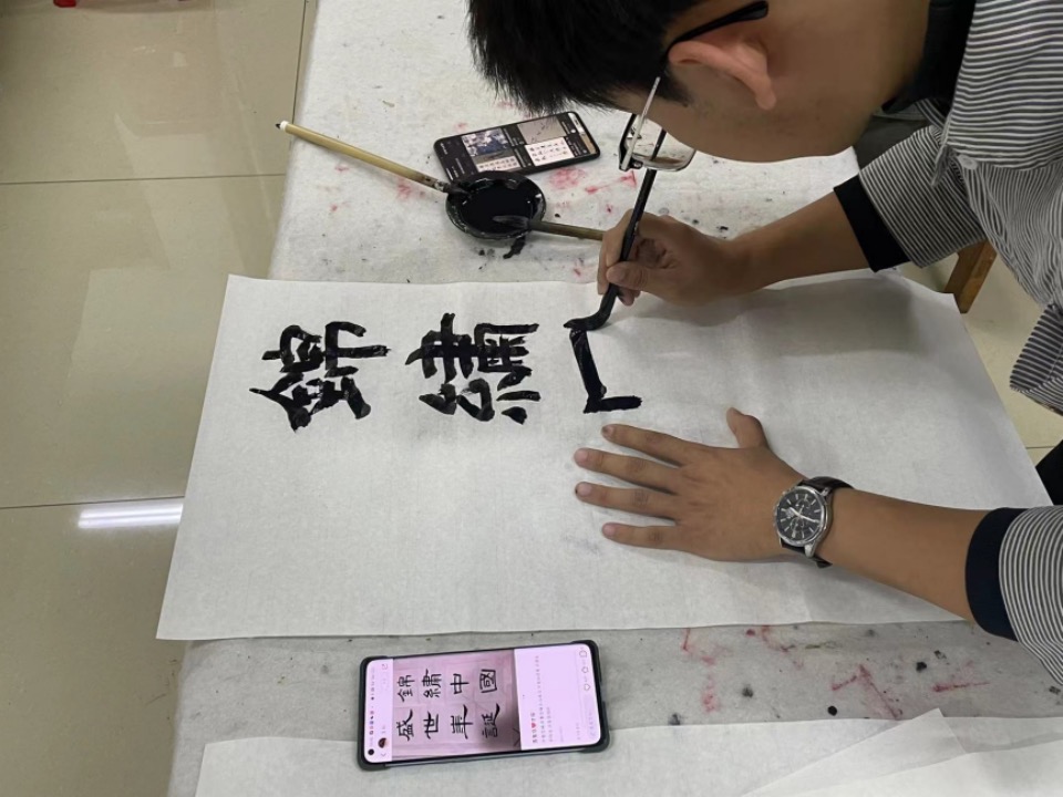 活动开始后党支部全体党员首先集体进行红色经典诵读——《共产党宣言》,之后在书法协会同学得现场指导下,党员们挥毫泼墨,书写红色经典名句、习语金句、党的奋斗目标等内容。