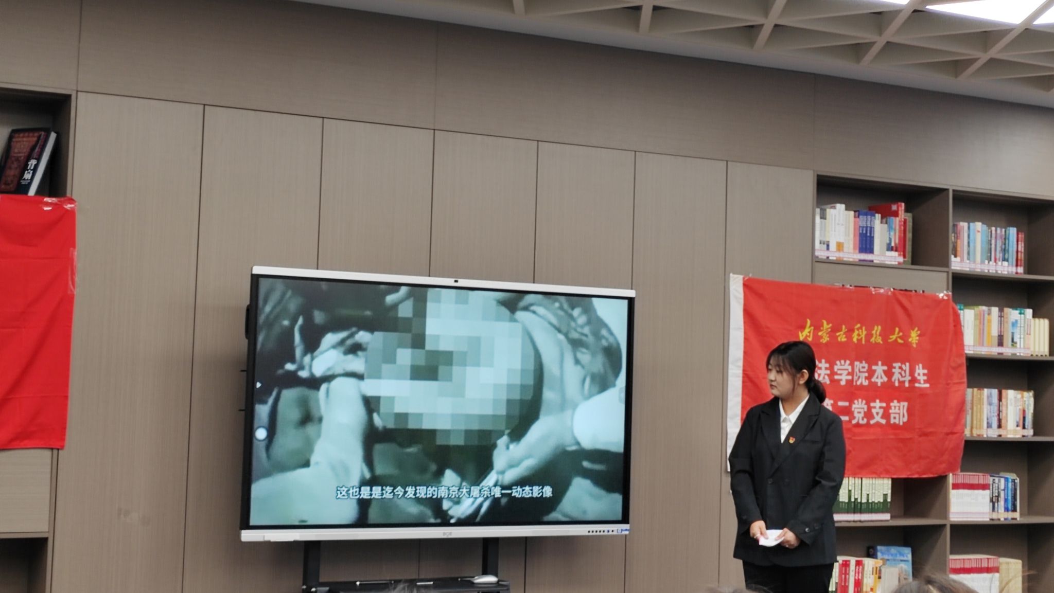 随后,全体师生党员、积极分子共同观看南京大屠杀相关视频,影片中,一幕幕触目惊心的画面,一段段悲愤交加的叙述,再现80多年前那场浩劫的恐怖场景,无数无辜生命的消逝,家园的破败荒凉,让人心情沉重,不禁为之动容。