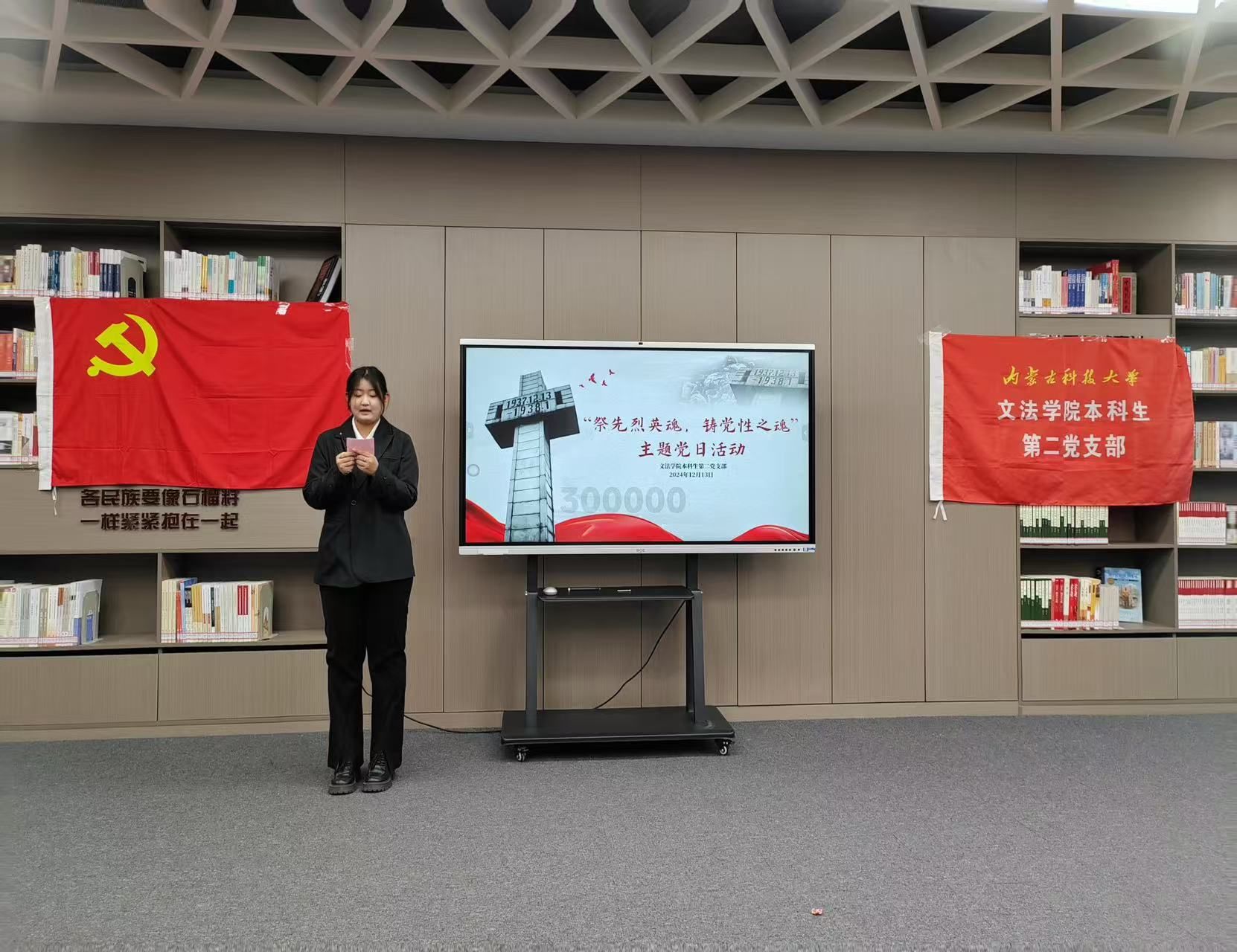 2024年12月13日下午,永利3044集团官网本科生第二党支部于图书馆“石榴籽”阅览室举办了一场以“祭先烈英魂,铸党性之魂”为主题的党日活动。活动旨在铭记历史、缅怀先烈,强化党员党性意识,弘扬英烈精神,支部全体师生党员及积极分子参与。