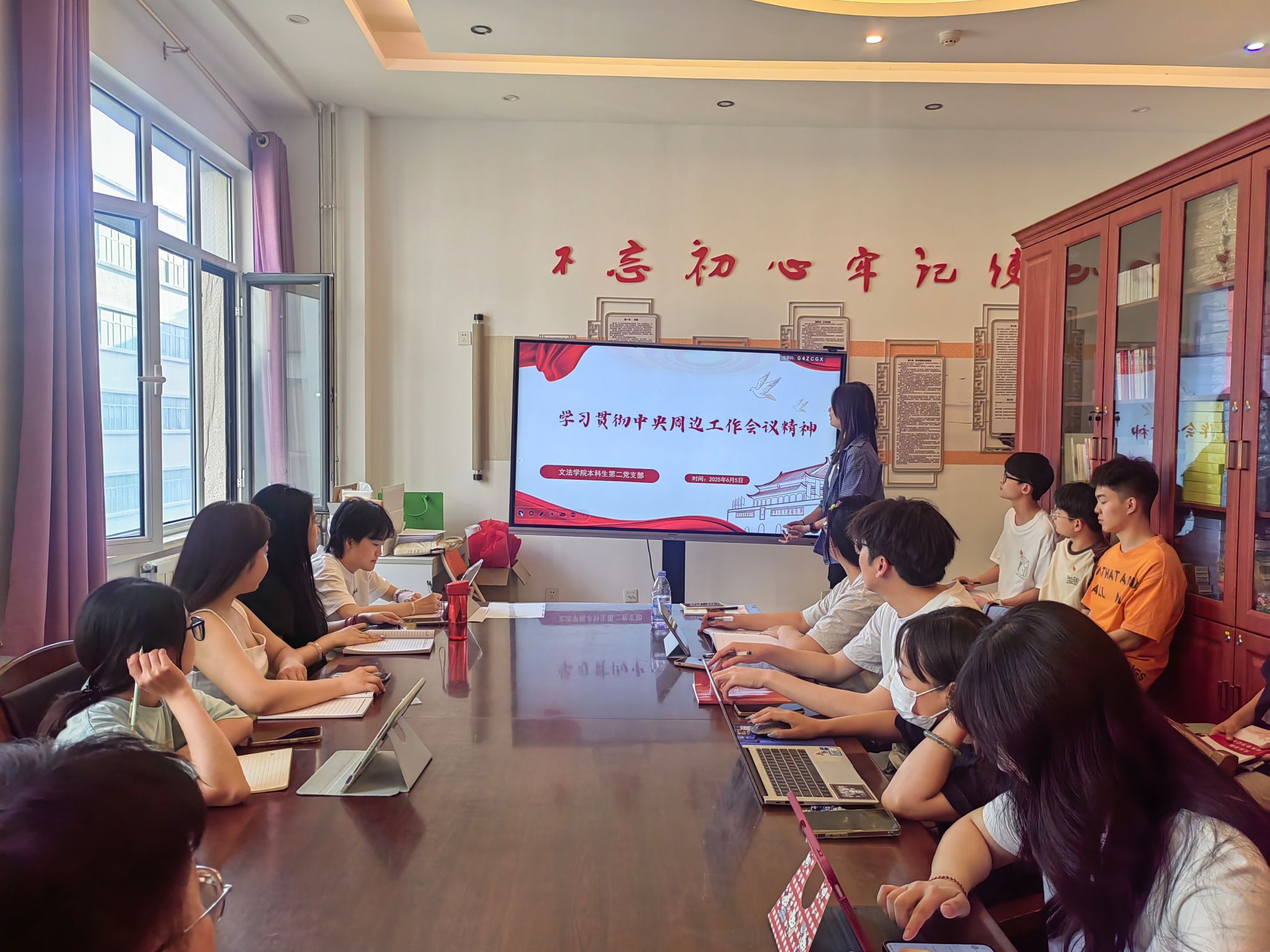 为深入学习贯彻中央周边工作会议精神,锚定新时代青年党员在国家周边工作中的责任坐标,永利3044集团官网本科生第二党支部于2025年6月5日在明德楼A308开展“学习贯彻中央周边工作会议精神”理论学习活动。会议由党员刘佳璐主持,通过PPT教学、视频学习与交流讨论等形式,展开深入研讨。