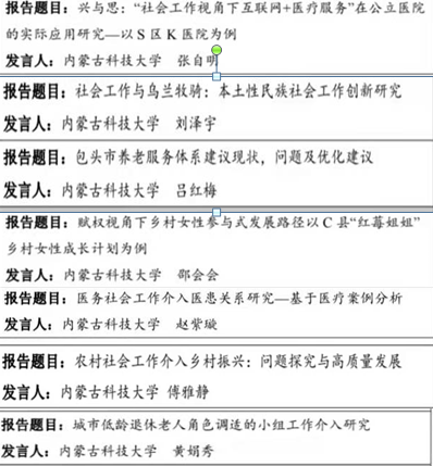 本次论坛的主题为“新时代与新使命下的内蒙古社会工作教育”,受疫情影响本次论坛采用线上交流分享的方式召开,论坛共设置了社会工作理论方法与实务、社会工作与乡村振兴、社会工作与社会治理和社会工作与地方服务四个分论坛。来自全区各高校的200余名师生参与了本届论坛,经过各高校教师的盲审评分,来自全区10所高校的32名本科生和研究生脱颖而出,入围了本次论坛的汇报阶段。