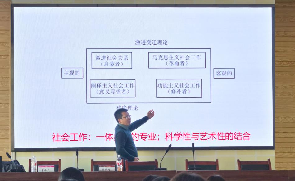 讲座中,袁小平教授在谈到社会工作本土化这一问题时强调了“新本土化”,即社会工作必须面对新的、更加紧迫和复杂的、要求更高的民生问题,并做出更加有效的回应。同时袁小平教授也讲到社会工作是具有多面性的,必须以回应当时当地的社会问题为现实关怀,并且要从个人与社会情景的交互改变中增进人类的福祉,从人在情境中来把握社会工作。