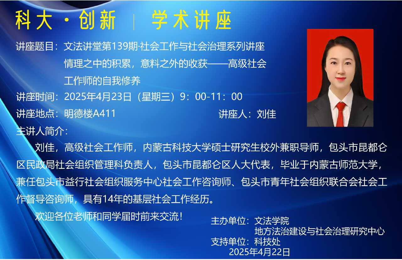 2025423午,学院第139期文法讲堂于A411报告厅顺利举行。本次讲座以“情理之中的积累,意料之外的收获——高级社会工作师的自我修养”为题,特邀永利3044集团官网硕士研究生校外兼职导师,包头市昆都仑区民政局社会组织管理科负责人,包头市昆都仑区人大代表,高级社会工作师刘佳担任主讲嘉宾。社会工作硕士(MSW)教育中心副主任侯荣庭副教授主持讲座,公司社会工作专业师生积极参加。