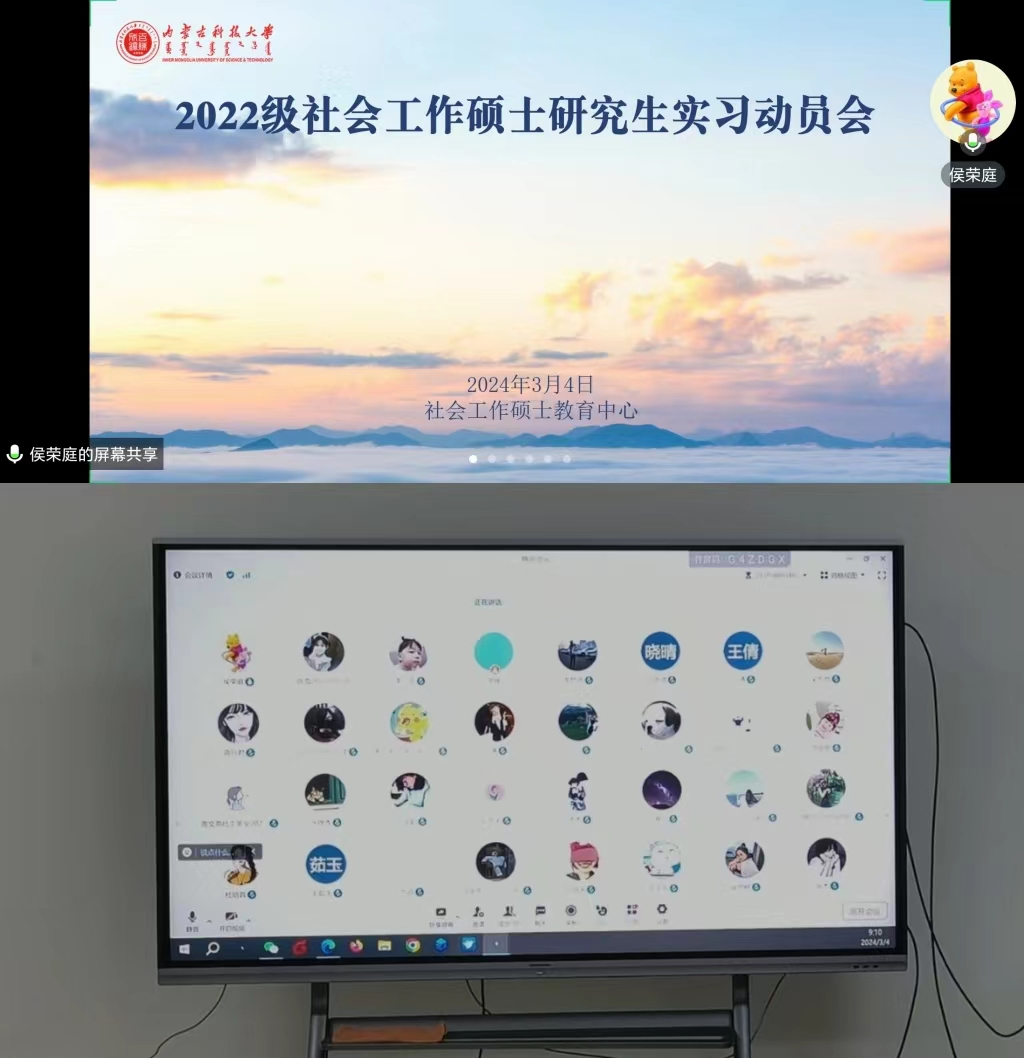 为引导员工做好专业实习前的各项准备工作,保障研究生实习工作有序开展,社会工作硕士教育中心于2024年3月4日上午9点在明德楼A302教室召开2022级社会工作研究生实习动员会。动员会由社会工作硕士教育中心副主任侯荣庭副教授主持,2022级社会工作全体硕士生通过线上和线下相结合的方式参与本次动员会。