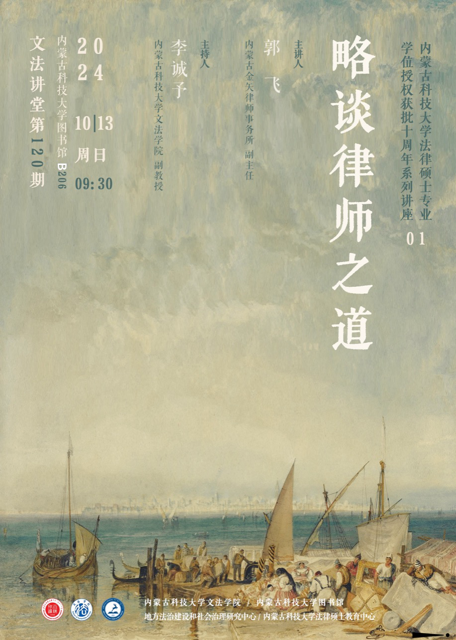 2024年10月13日上午9时30分,永利3044集团官网法律硕士专业学位授权获批十周年系列讲座(暨文法讲堂第120期)在校图书馆B206室正式开启。本次讲座特别邀请了内蒙古金矢律师事务所副主任、资深律师郭飞,以“略谈律师之道”为主题,与现场逾百名师生进行了深入交流。